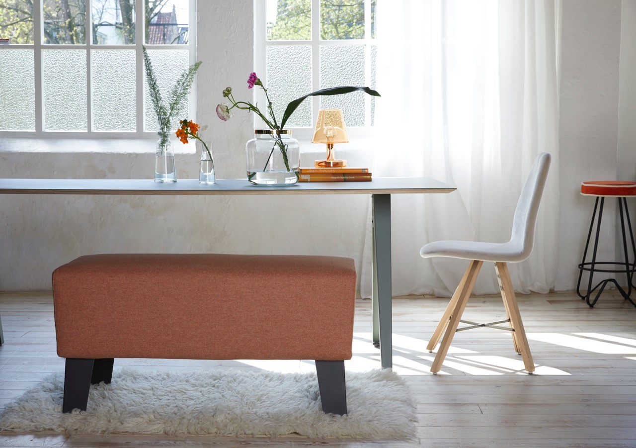 Er zijn diverse standaard afmetingen in ons assortiment en ook maatwerk is voor ons geen probleem. U kunt de bank dus altijd naar eigen wens laten maken. De zijkanten zijn standaard in staal –naar wens in verschillende kleuren– maar ook mogelijk in eik fineer.