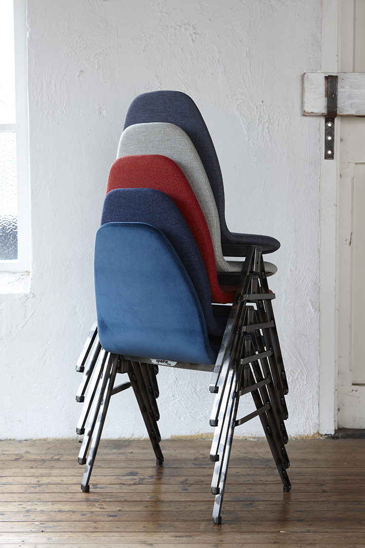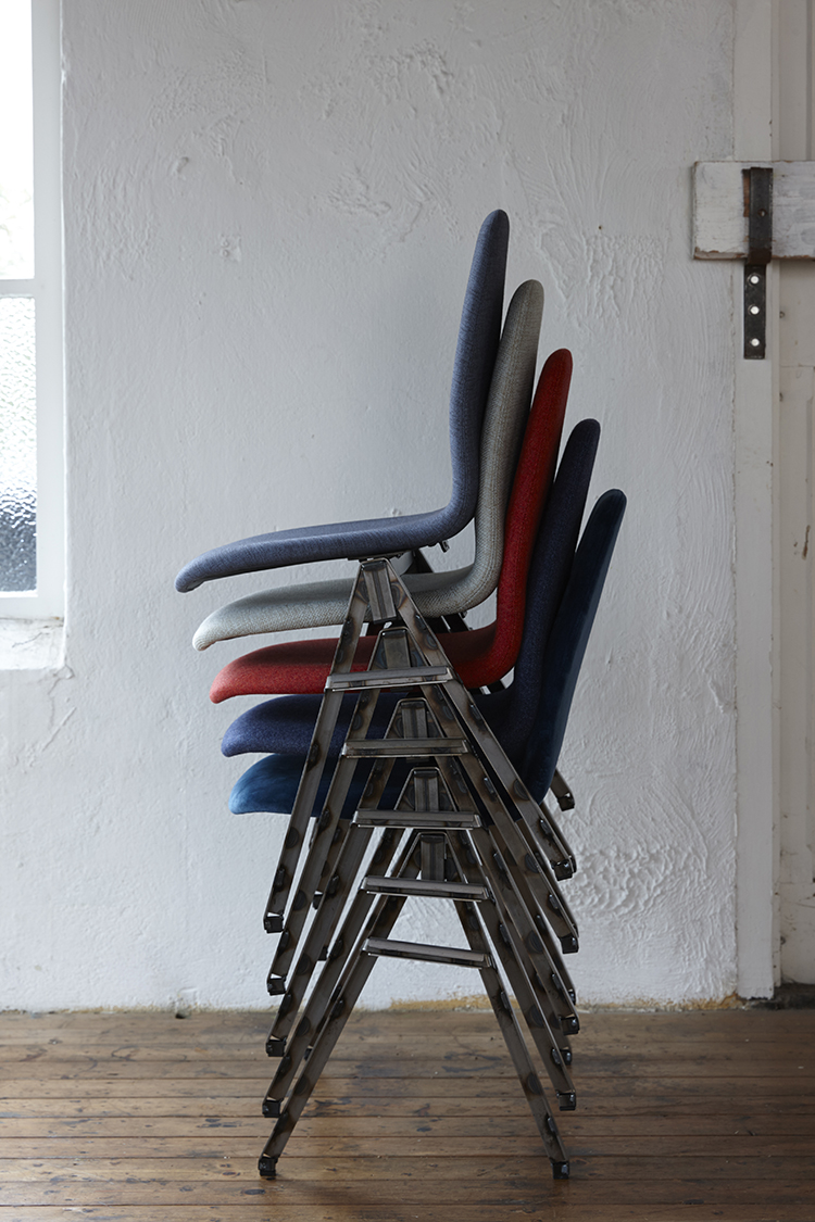 De zitting van de stapelstoel is gestoffeerd mogelijk of met een houten kuip en heeft een stalen frame.