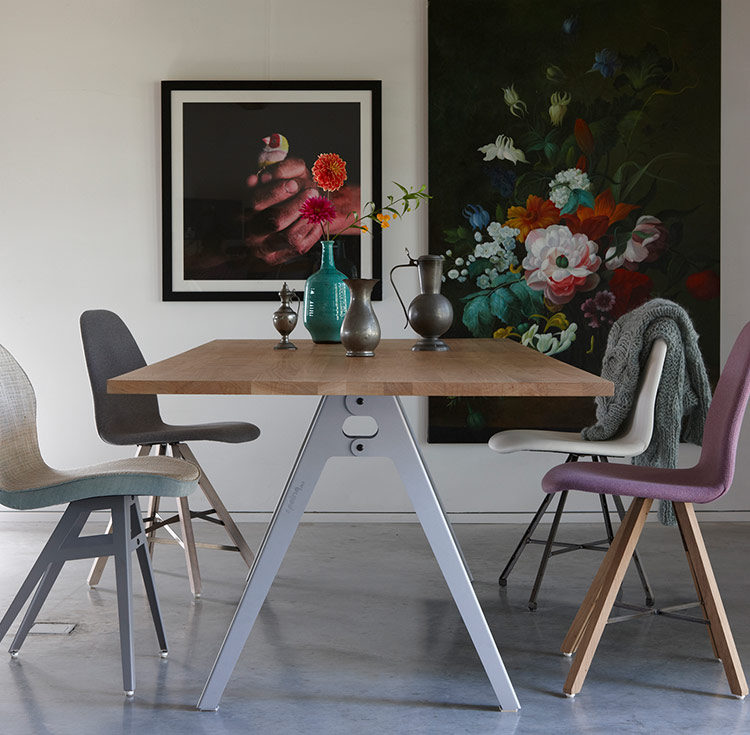 De tafel Jane is een ontwerp van Ruud-Jan Kokke en heeft een mooi frame van gelaserd en gevouwen staal. De poot is lichtjes gebaseerd op een knijper en heeft als mooi detail Spoinq uitgelaserd. De tafel Jane is verkrijgbaar in diverse afmetingen met een eiken blad en Forbo desktop. Mocht u een ander blad op poot Jane willen dan kan dat ook.