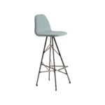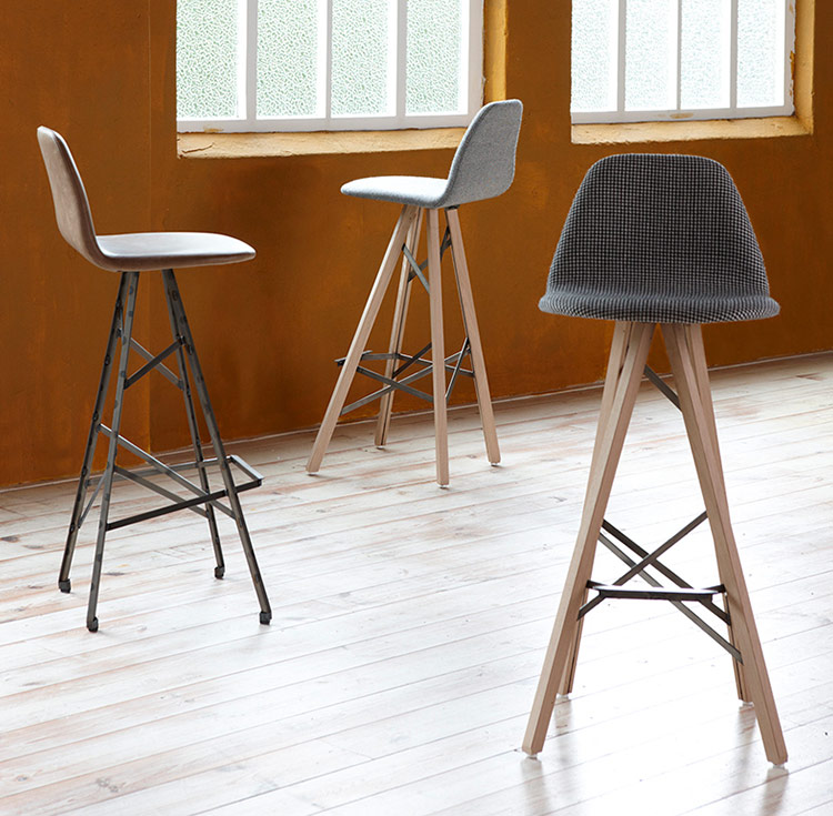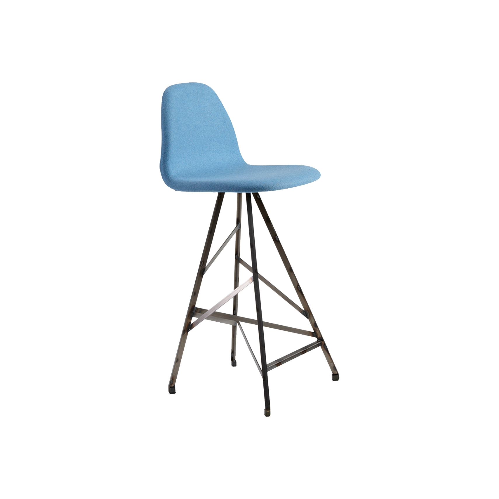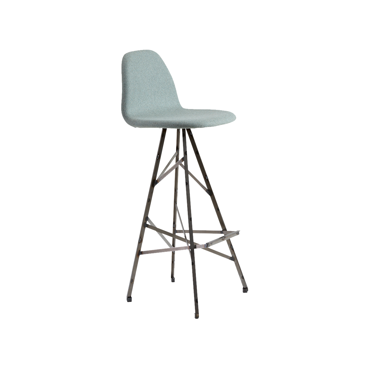 De zitting is gestoffeerd en kan met zowel een lage rug als een hoge rug. Het onderstel is van staal, en dit kan weer naar keuze worden gecoat in diverse kleuren. Er zijn 2 zithoogtes mogelijk; 65cm, voor aan bijvoorbeeld de keukenbar, en 75cm.