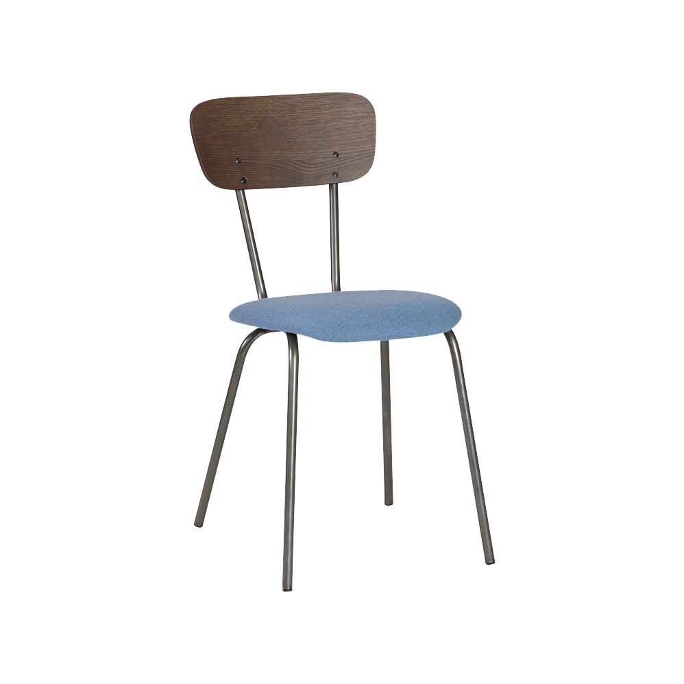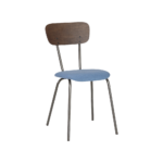 De rugleuning kan ik eiken naturel, eiken wengé of whitewash. Het stalen frame kan in diverse kleuren worden gecoat en de stoffering is naar eigen keuze.