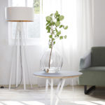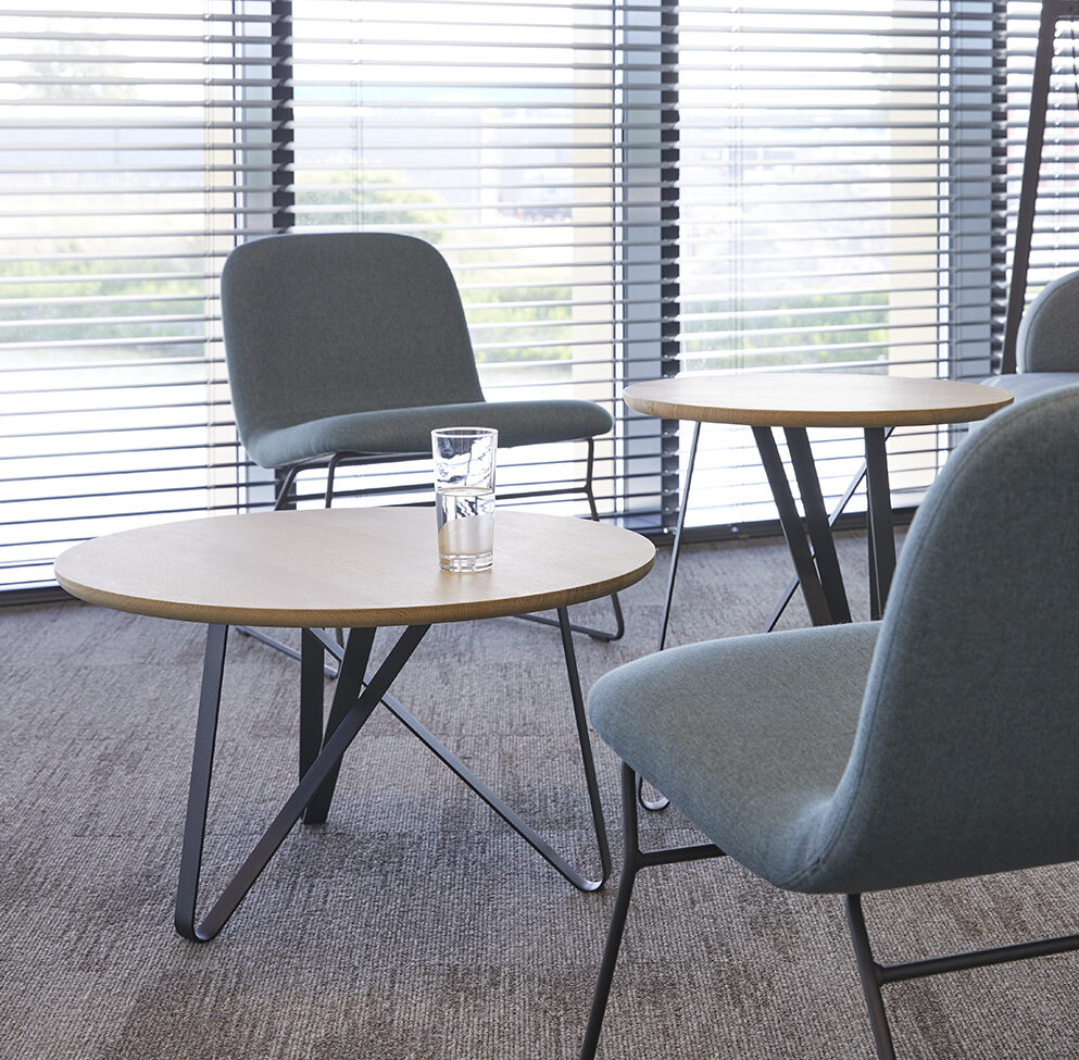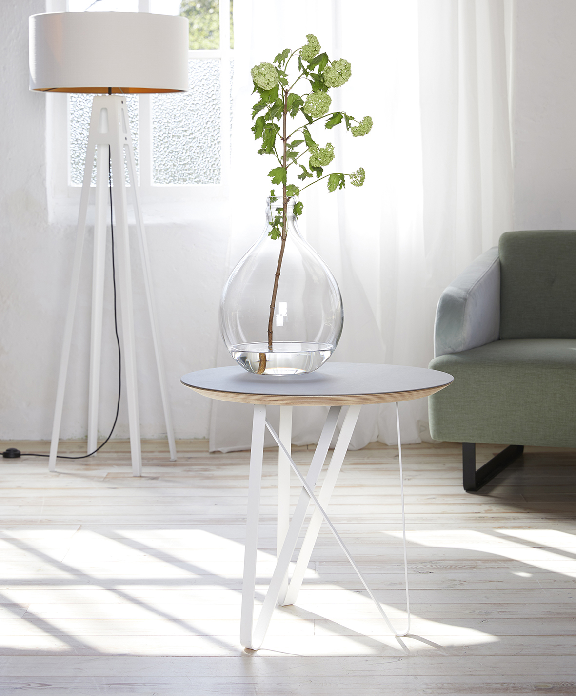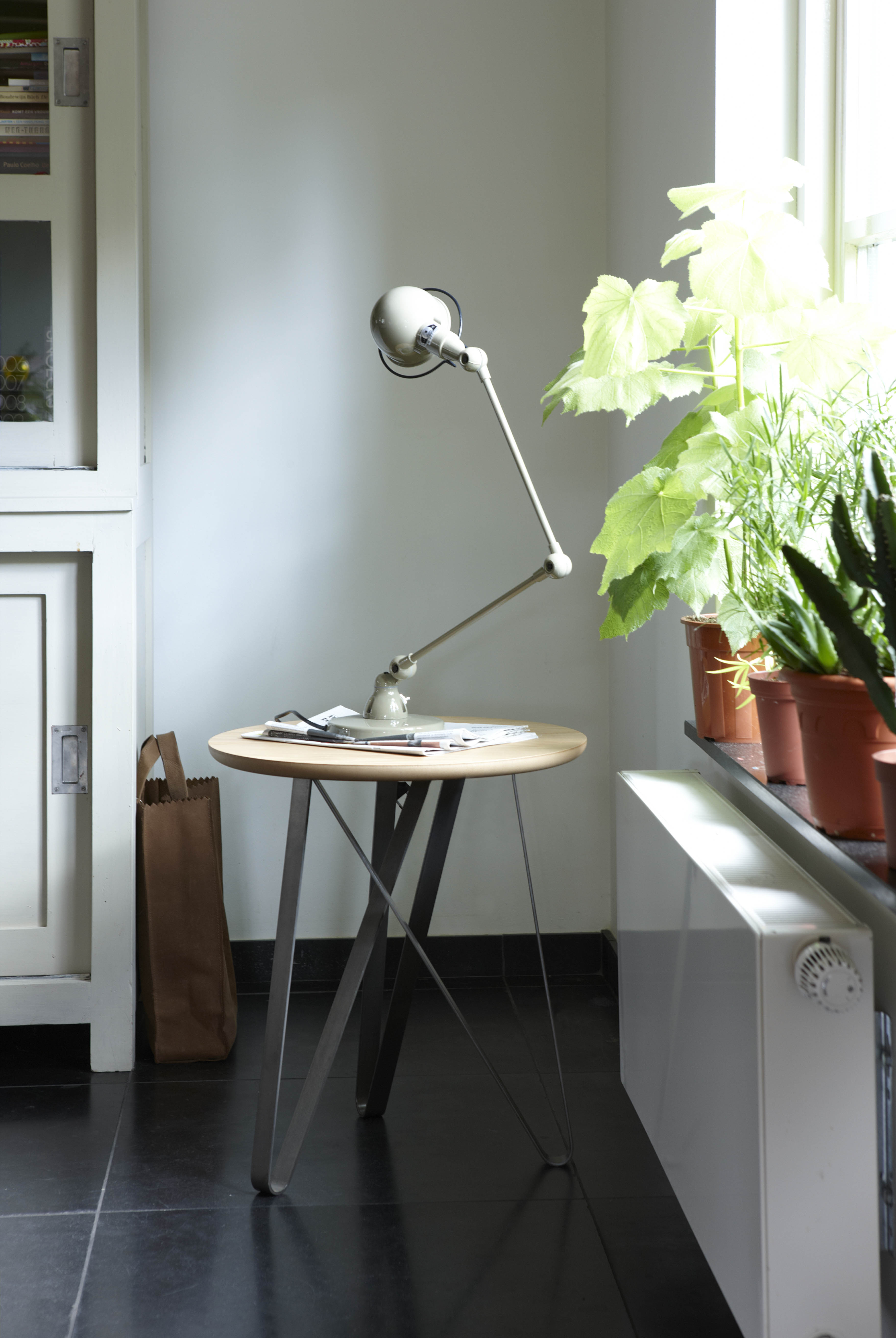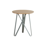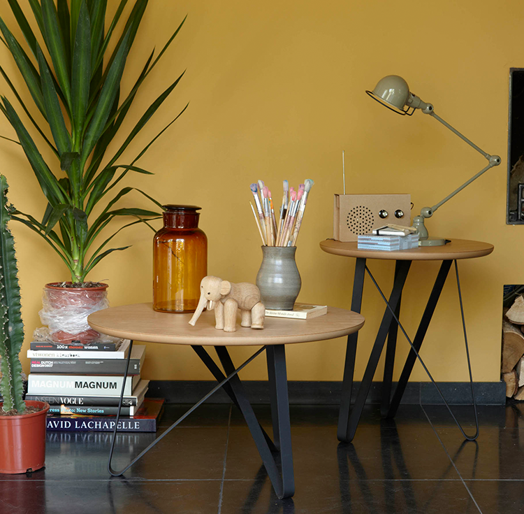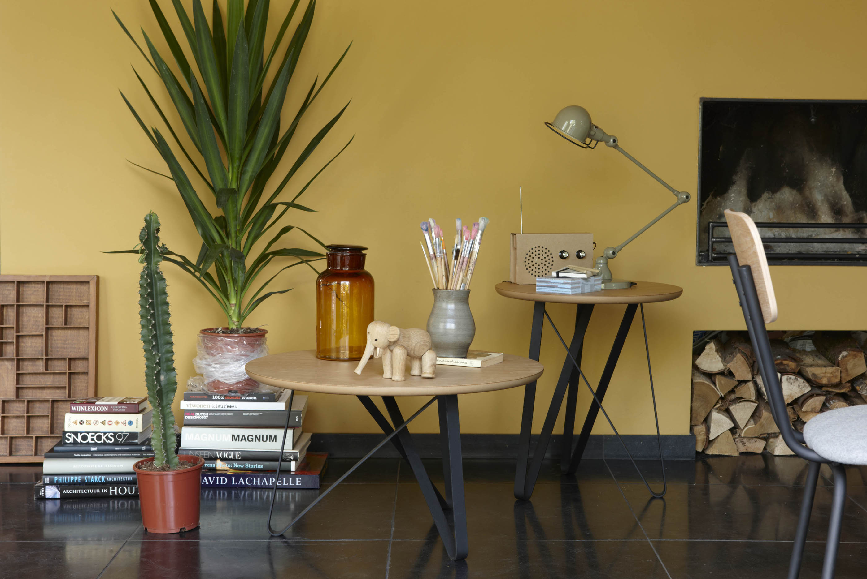 Deze speelse industriële salontafel Twister is een ontwerp van Marc van der Voorn. De design salontafel heeft een massief eikenblad met een diameter van 50 cm en een ronde afloop en is 56 cm hoog. De salontafel Twister kan ook worden uitgevoerd met een blad van Forbo desktop of HPL top.