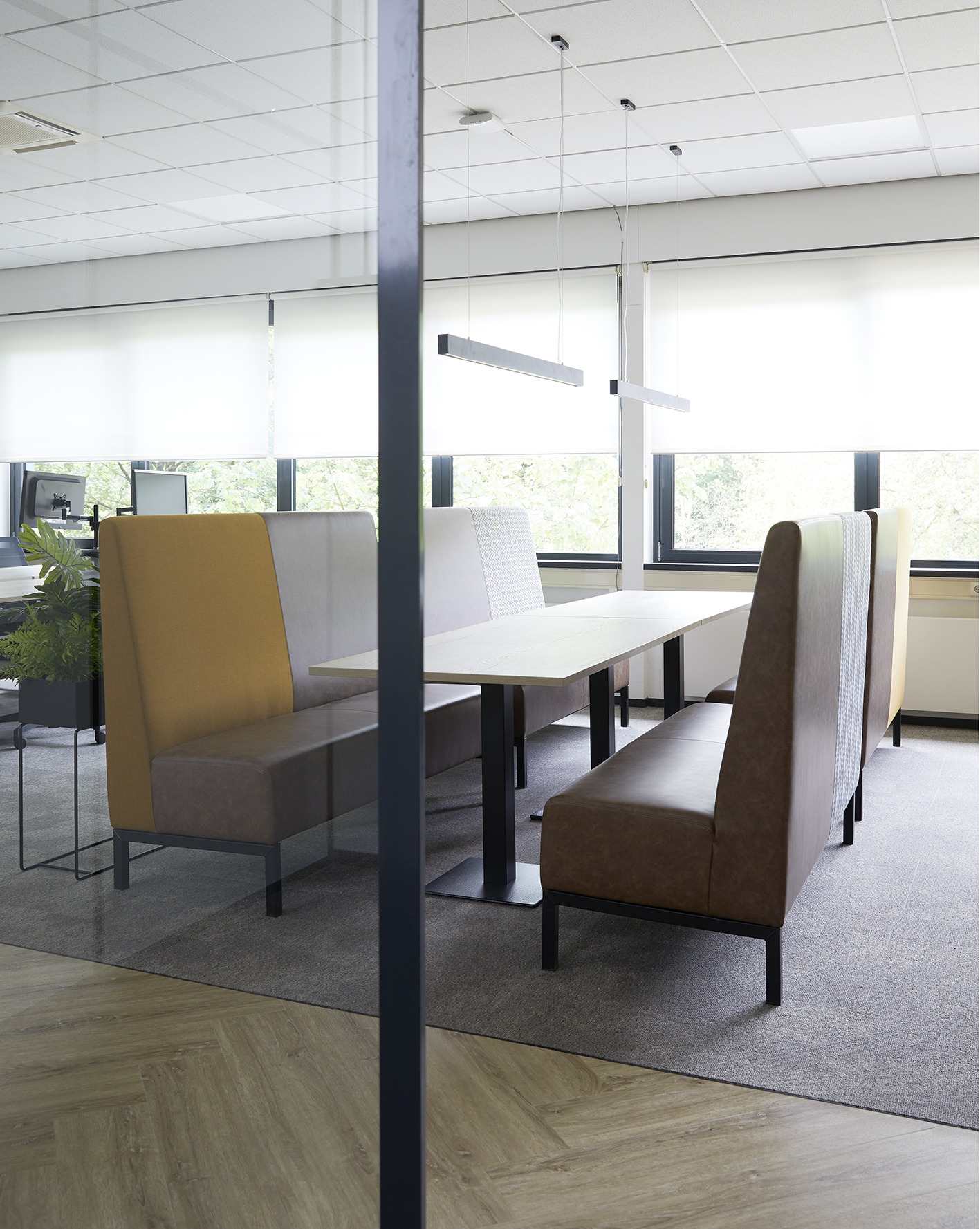 Les canapés Lars offrent une cloison colorée dans ce bureau récemment meublé. Idéal pour discuter ensemble. Les bancs sont conçus ici comme une version extra haute de 160 cm. haute. Project: Lyon Office Support